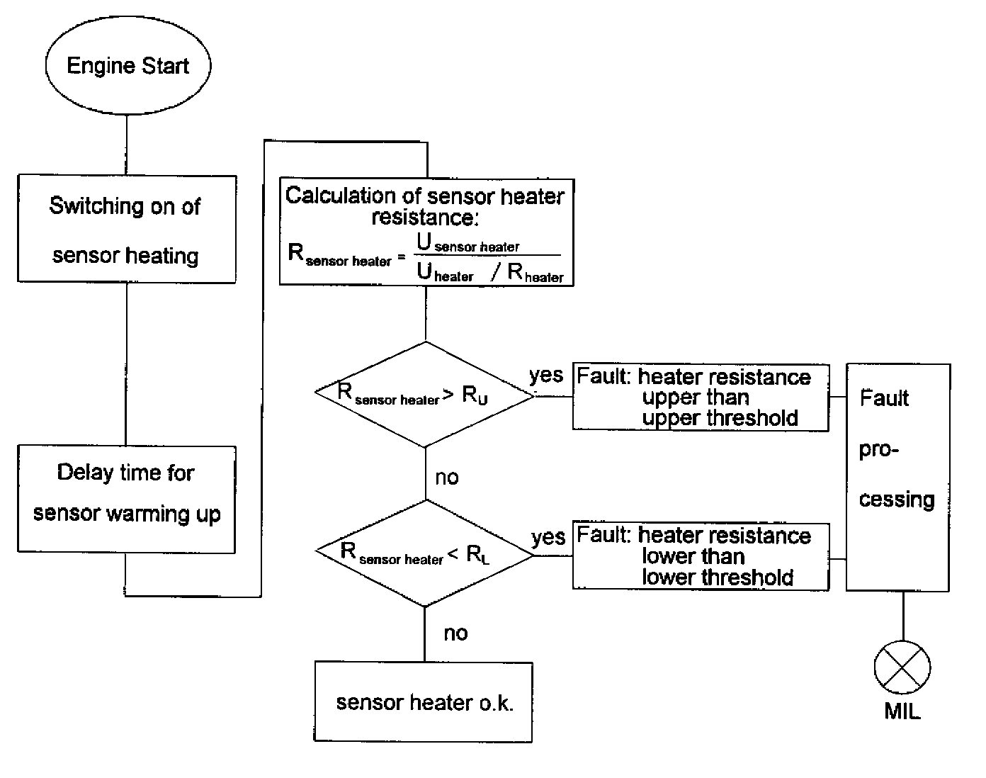 The monitoring function measures both, sensor heater current (voltage drop over a shunt) and the heater voltage (heater supply voltage) to calculate the sensor heater resistance.
