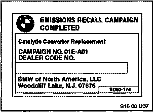 After the vehicle has been corrected, obtain a label (SD92-174) and with a ball point pen print your BMW center code (5 digits) on the Recall Completion Label (see illustration). An initial quantity of 30 labels will be sent to all BMW automotive centers. Peel the label from its backing and affix it to the left front strut tower (in the engine compartment) next to the Vehicle Emission Control Label.