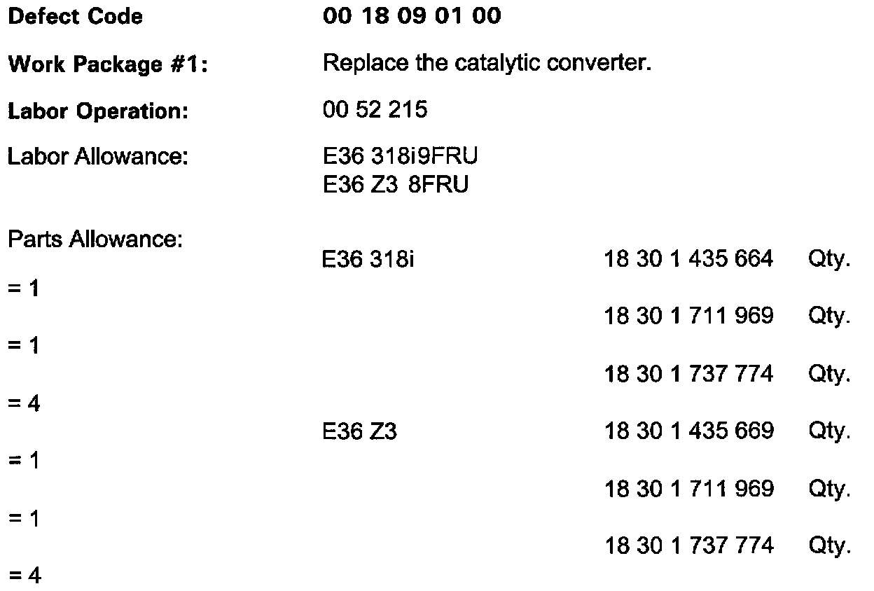 Replace the catalytic converter on all affected vehicles and if necessary ("Check Engine Light" is on) delete any catalytic converter related fault codes stored in the Engine Control Module (ECM/DME).