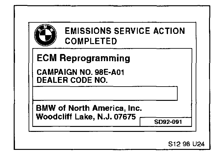 After the vehicle has been checked and corrected, obtain a label (SD 92-091) and with a ball point pen print your dealer code (5 digits) on the Service Action Completion Label (see illustration). An initial quantity of 100 labels will be sent to all BMW automotive retailers. Peel the label from its backing and affix it to the left front strut tower (in the engine compartment) next to the Vehicle Emission Control Label.
