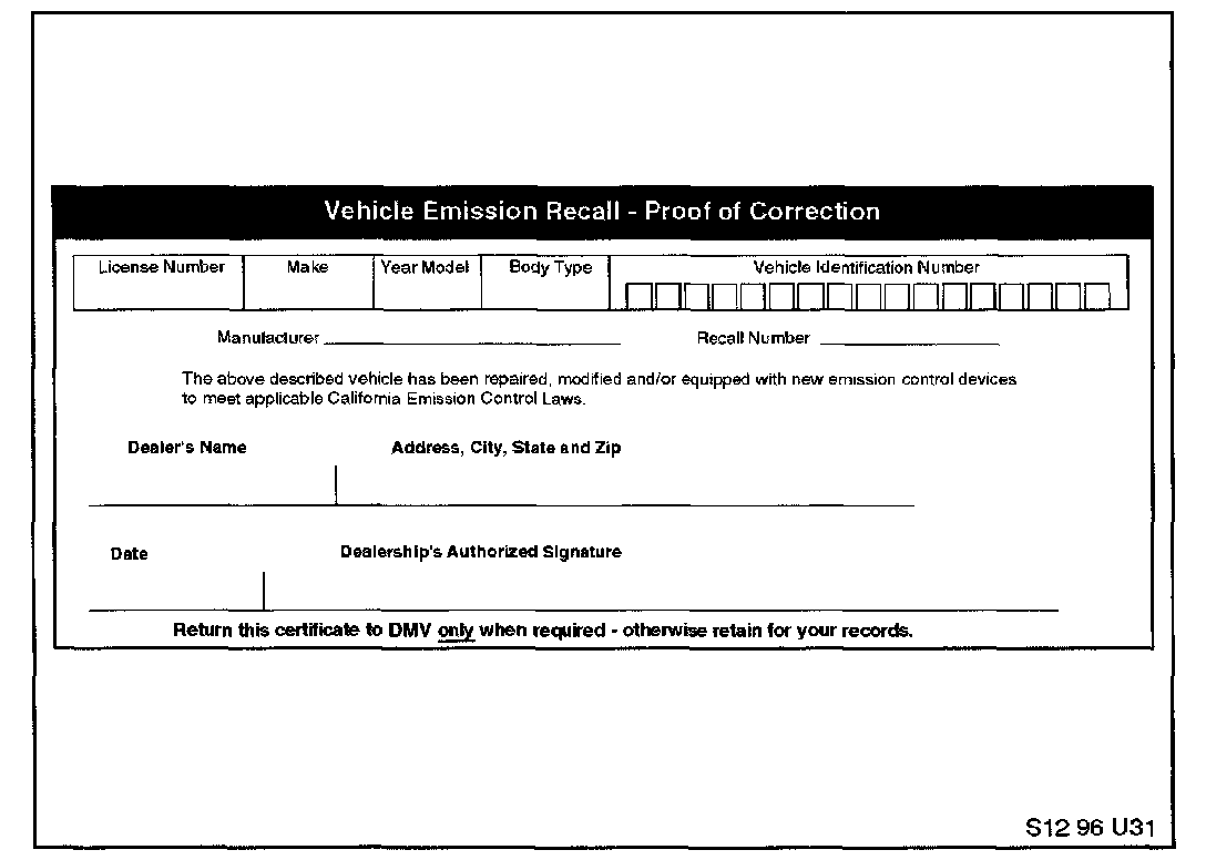 For California retailers only it is required by the California Code of Regulations that an executed orange "Vehicle Emission Recall - Proof of Correction" certificate (SD92-084 - see illustration) be provided to each customer (for vehicles registered in the state of California) once the Service Action on their vehicle has been completed. All California BMW automotive retailers will receive an initial quantity of certificates.