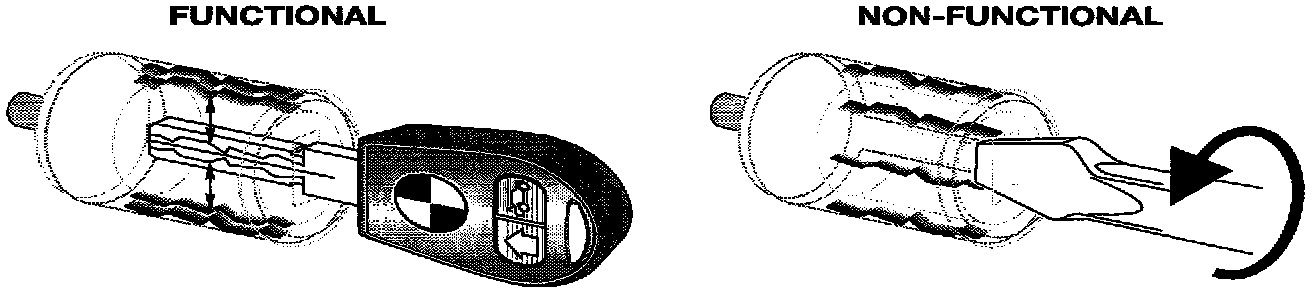 All E36 models are now equipped with this feature which was first introduced on the E38. If an incorrect key or object (screwdriver) is placed in the door lock for forcible entry, the cylinder freewheels to minimize damage and unauthorized lock operation.