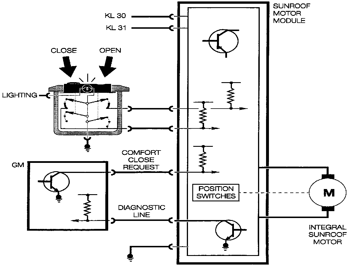 The sunroof module detects the digital inputs from the switch as requests to open or close the sunroof.