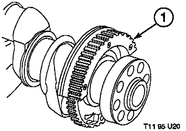 The trigger wheel (1) for the RPM/reference sensor is bolted directly to the crankshaft on the rear main counterweight.