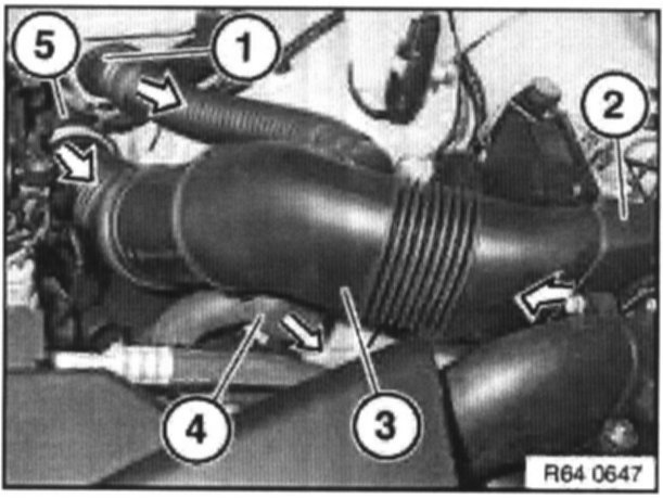 Remove molded hose between hot-film air-mass flow sensor and turbocharger.