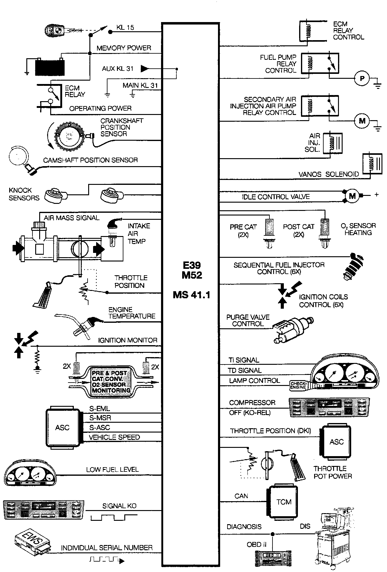 The M52 - 2.8 liter engine will be installed in the 528i. The engine is carried over from the 1996 E36 and conforms to the 1997 requirements for OBD II emission control standards. The Siemens MS 41.1 engine management system is used for fuel injection and ignition control with minor changes to adapt it for use in the E39. Detailed information on the M52 and MS 41.1 systems is found in the 1996 E36 introduction handouts.