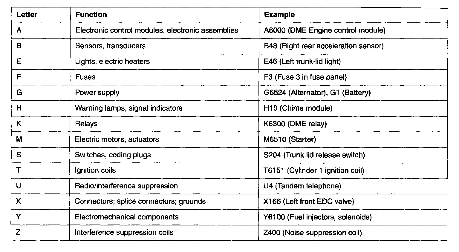 Table B. BMW electrical component designation
