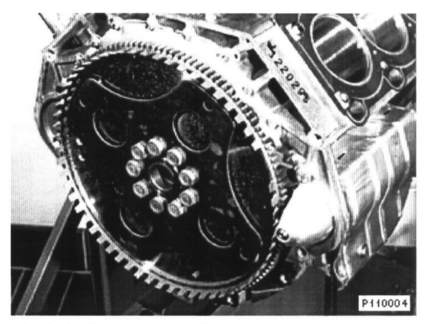 As on the M73 engine, the increment gearing for the crankshaft sensor is located on the flywheel for both variants. The inductive pulse generator is mounted in the transmission/clutch bell housing. The new installation location for the increment wheel on the flywheel now makes it possible for the DME control unit to detect misfiring.