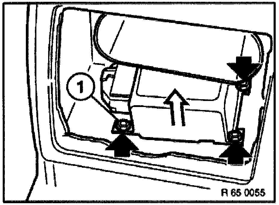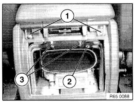 - Unfasten screws (1 and 3), with eject box only unfasten screws (1) and, if necessary, remove center armrest with complete eject box.