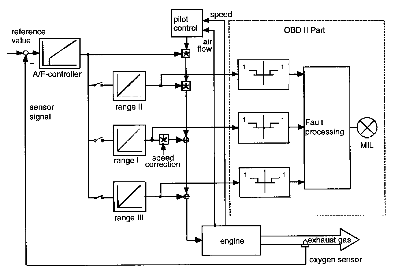The ECM-controller compares the oxygen sensor signal of the sensor upstream the catalyst with a reference value and calculates a correction factor for the pilot control.