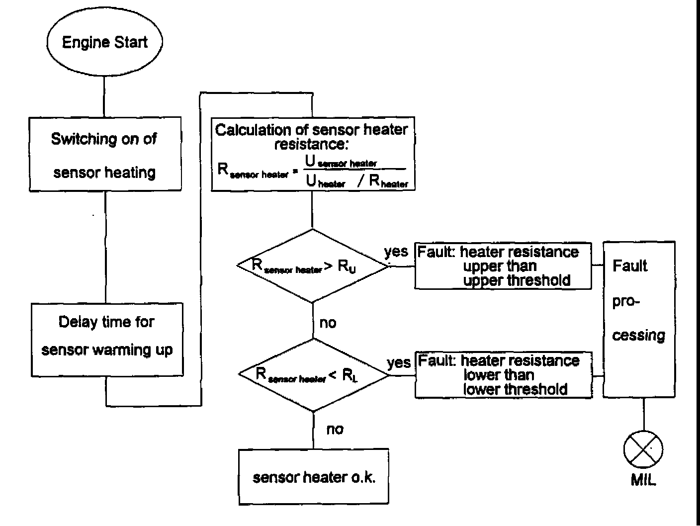 The monitoring function measures both, sensor heater current (voltage drop over a shunt) and the heater voltage (heater supply voltage) to calculate the sensor heater resistance.