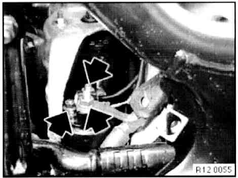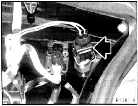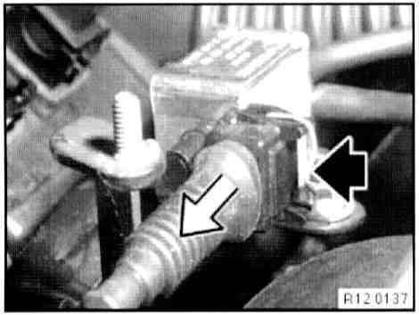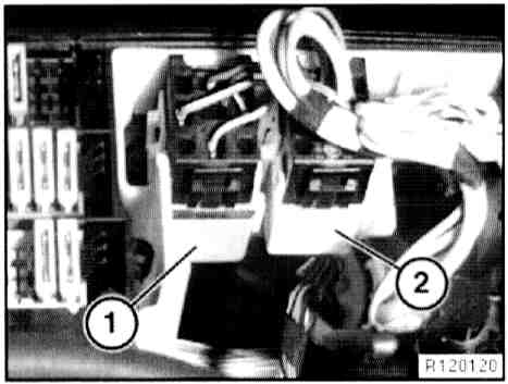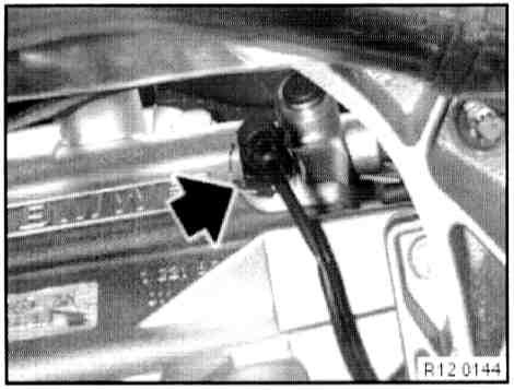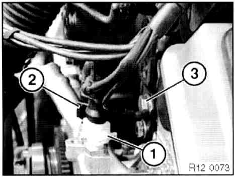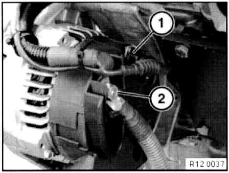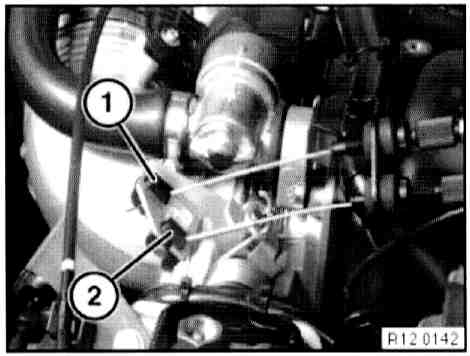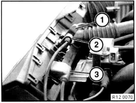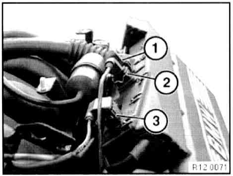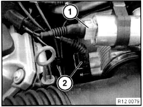 - Disconnect plug connection (1) on idle speed adjuster and plug connection (2) on throttle valve potentiometer.