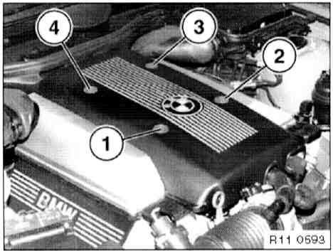 - Open press-studs (1...4) one at a time, at the same time lifting the acoustic cover slightly. Once all four press-studs have been opened, remove the acoustic cover.
