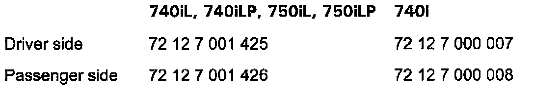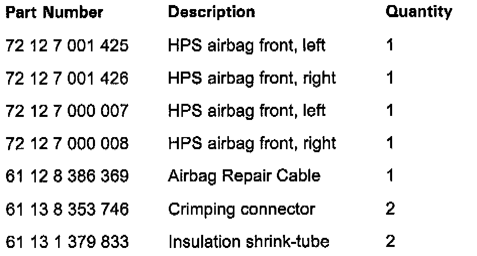 In September of 1999, a new type of front Head Protection System airbags were introduced into series production. Only the new type HPS airbags (with inert gas generators) are available from the BMW Parts Distribution Centers for replacement purposes (e.g. after deployment caused by an accident). In case the new style Head Protection System airbag is retrofitted into a E38 vehicle manufactured prior to 09/99, a certain modification to the airbag mounting points in the vehicle, and to the firing circuit harness is required. The table provides part numbers for the new HPS airbags: