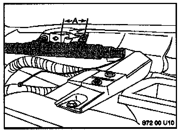 3. Mark the position of retaining lugs on the bulkhead. The distance (A) from the edge of instrument cluster holder to the center of bore hole of retaining lugs on HPS gas generator should be equal to 21 mm +/- 1 mm.
