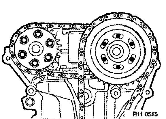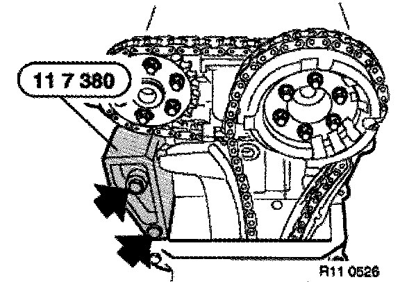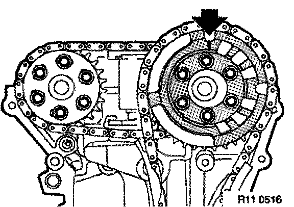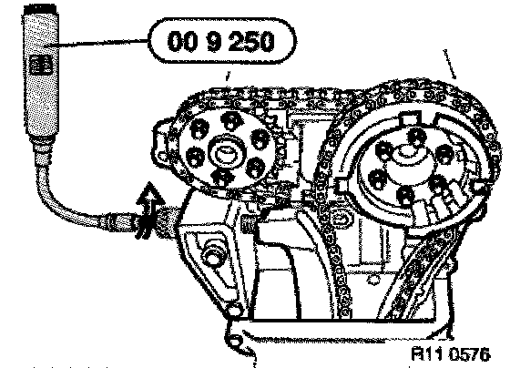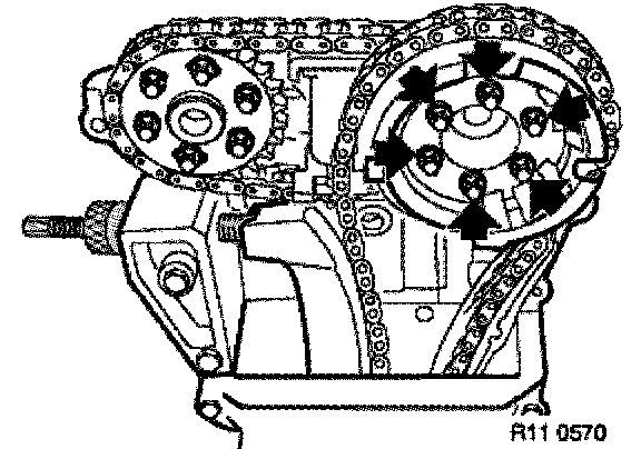 Brace sprocket, press bow cover against the timing chain and check position of long bores on both cylinder banks.