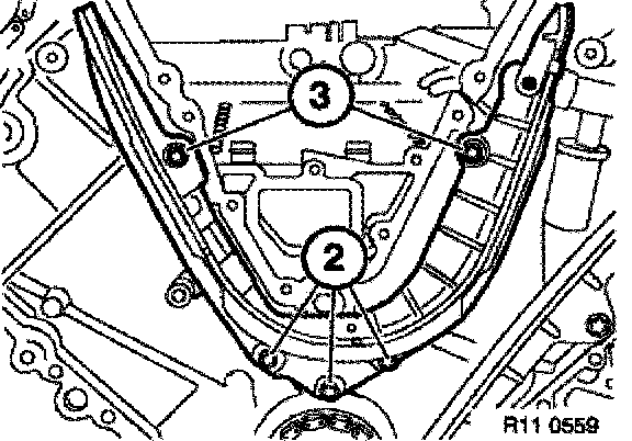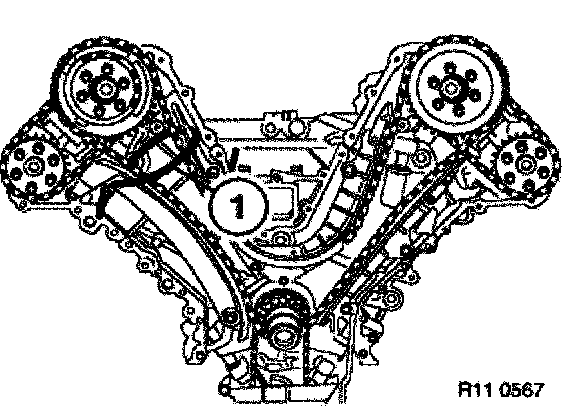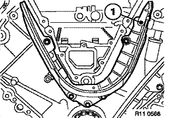 Press bow cover against the timing chain. Secure bow cover with a plastic strap (1).