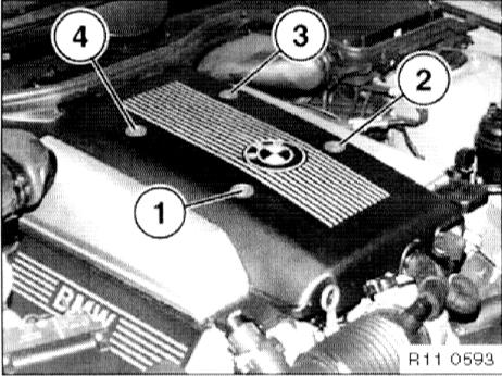 - Open press-studs (1...4) one at a time, at the same time lifting the acoustic cover slightly. Once all four press-studs have been opened, remove the acoustic cover.