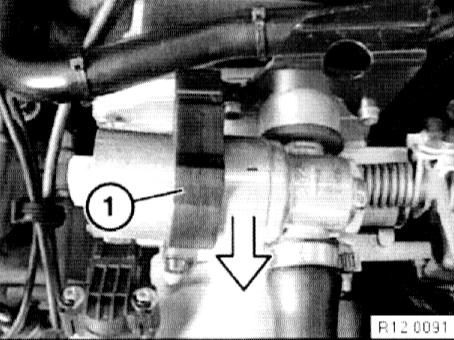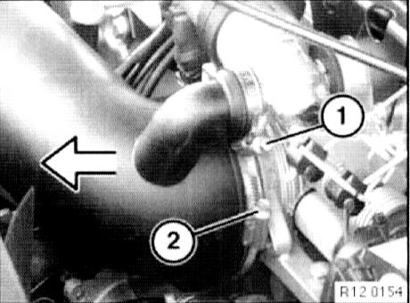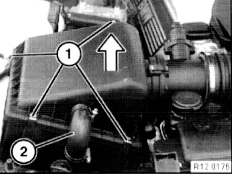 - Open clips (1), unfasten hose clip (2) and remove hose. Lift off upper section of air filter housing.