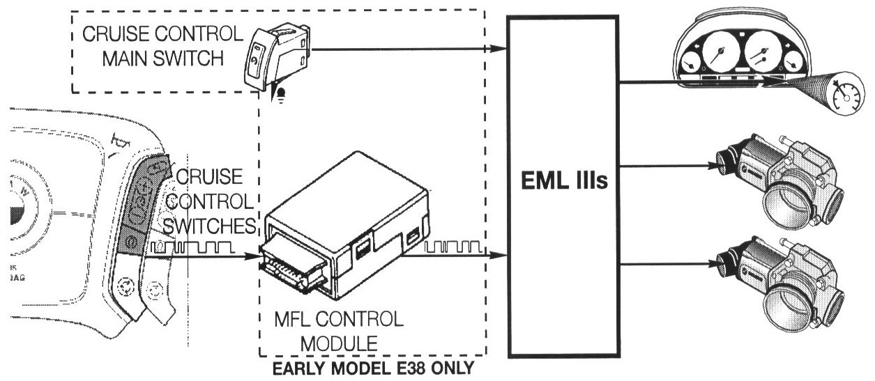 All functions of the cruise control system are incorporated in the EML IIIs control module. The cruise control main switch is wired directly to the EML IIIs control module. The multi-function steering wheel inputs are direct to the EML through a separate serial data bus.