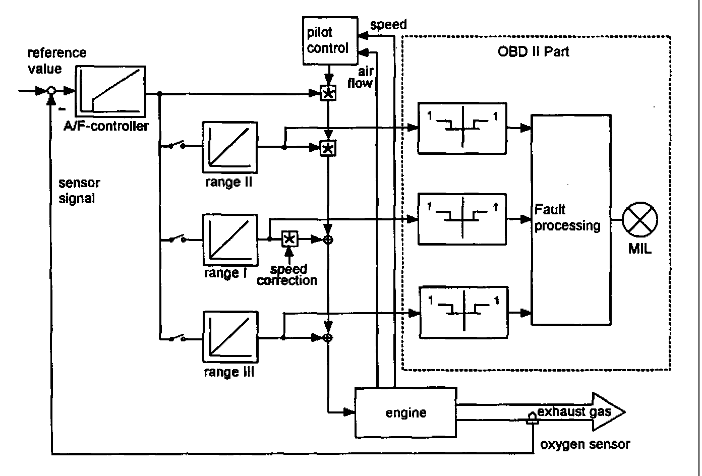 The ECM-controller compares the oxygen sensor signal of the sensor upstream the catalyst with a reference value and calculates a correction factor for the pilot control.