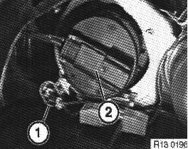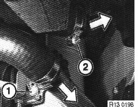 Unfasten hose clips (1 and 2) and remove hoses.