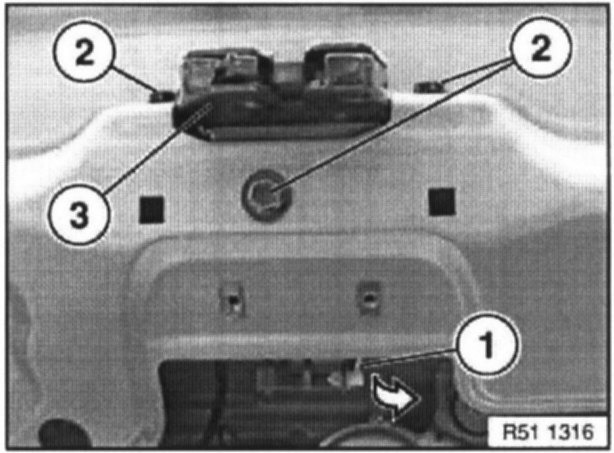 Disconnect plug connector (1) and remove luggage compartment lid lock (2).
