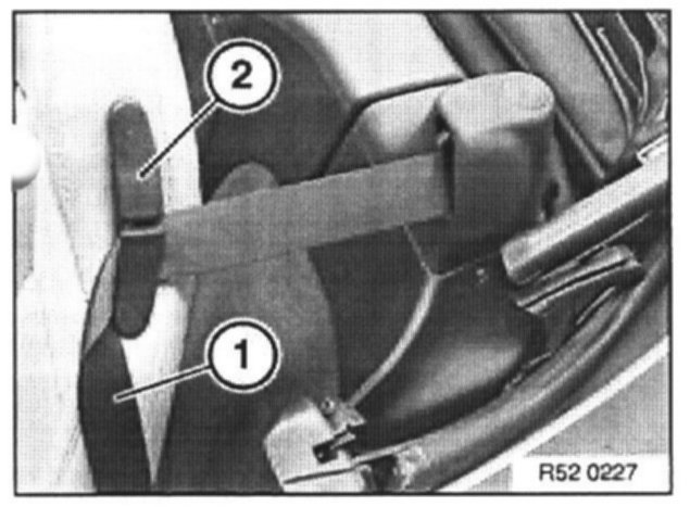 - Withdraw seatbelt strap (1) from seatbelt guide (2).