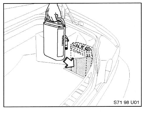 M roadsterRemove the unit from its shipping container and place it in the receptacle in the right side of the trunk as illustrated. The hoses and wires on the unit must face towards the outside of the car.