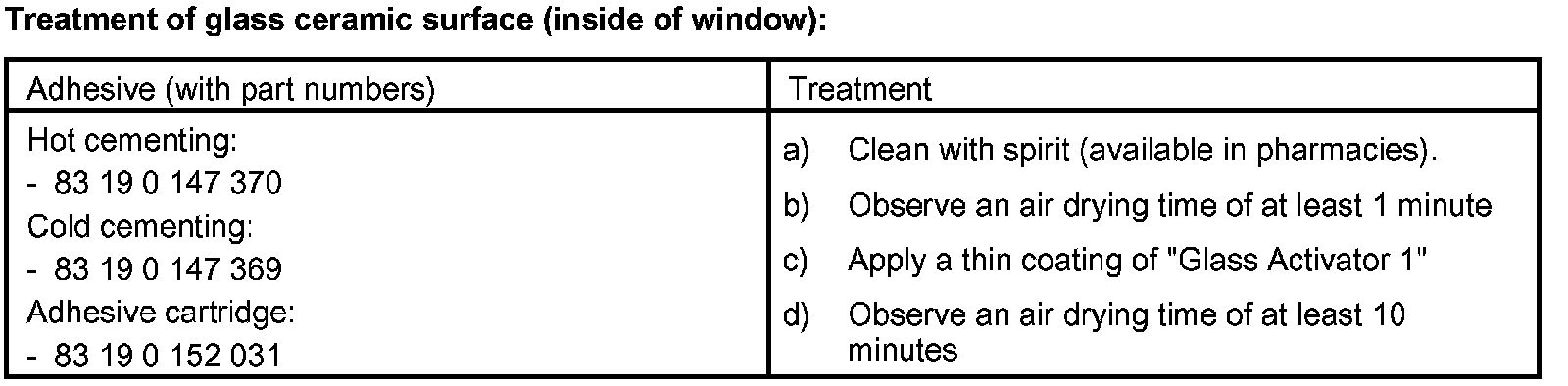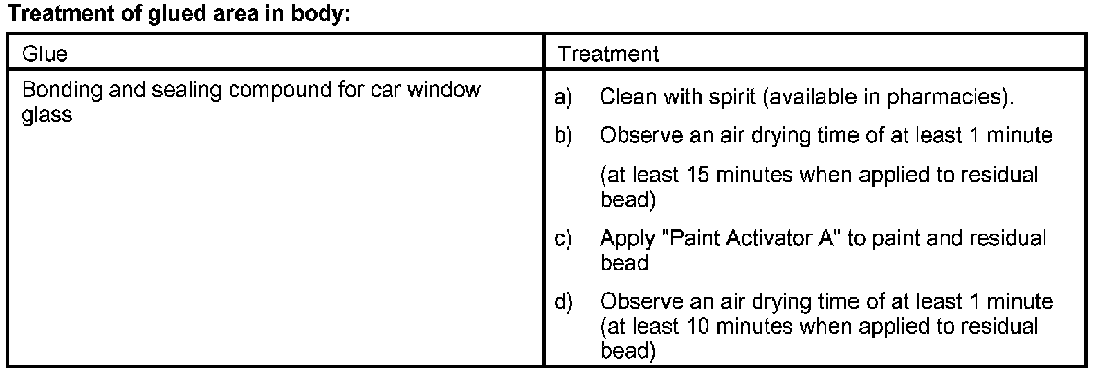 The windscreen and rear window (also the rear side windows if necessary) are bonded to the body. This gluing will increase the torsional strength of the vehicle. To obtain perfect bonding, comply with the installation procedure described in the following.