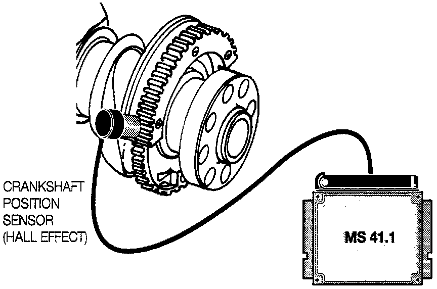 A Hall sensor is used for the crankshaft position sensor input signal on the MS41.1 system. The RPM/reference sensor is mounted on the left side at the rear of the cylinder block. The trigger wheel is now mounted inside the crankcase, on the crankshaft, at the rear main bearing support. The trigger wheel still contains 58 teeth with a gap of two missing teeth.