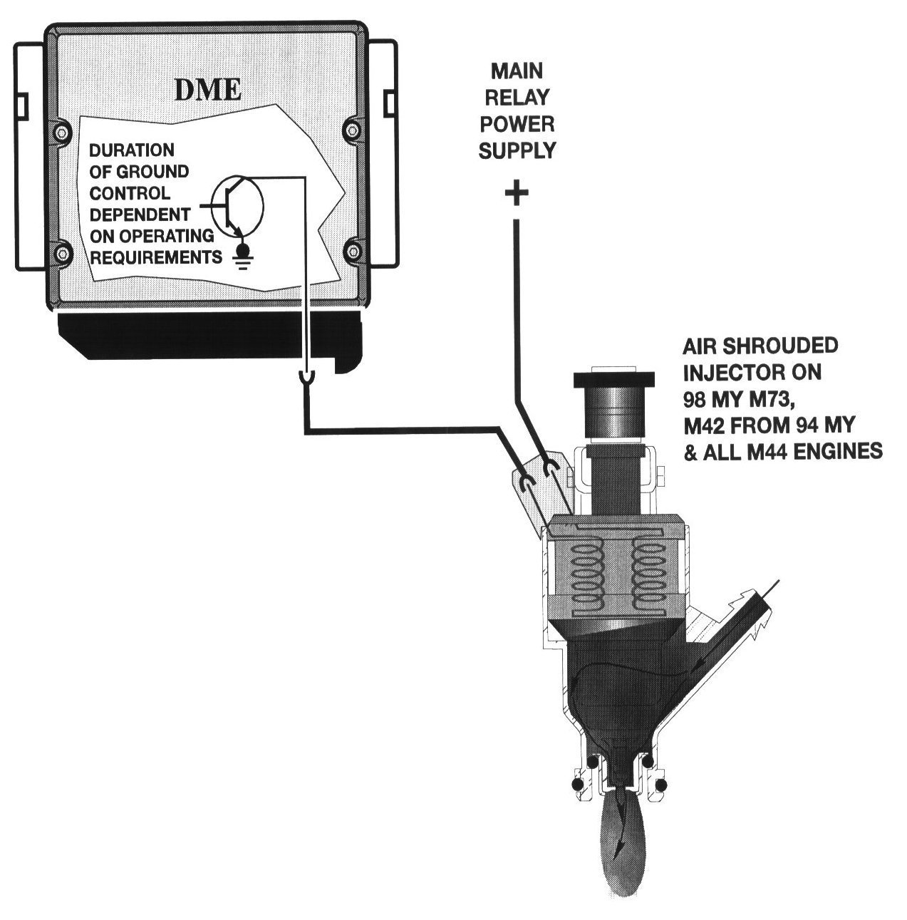 The injectors receive operating power from the Main Relay. The ECM provides the injector with a ground for a calculated duration of time (ti) providing the ideal air fuel ratio for all engine operating conditions.