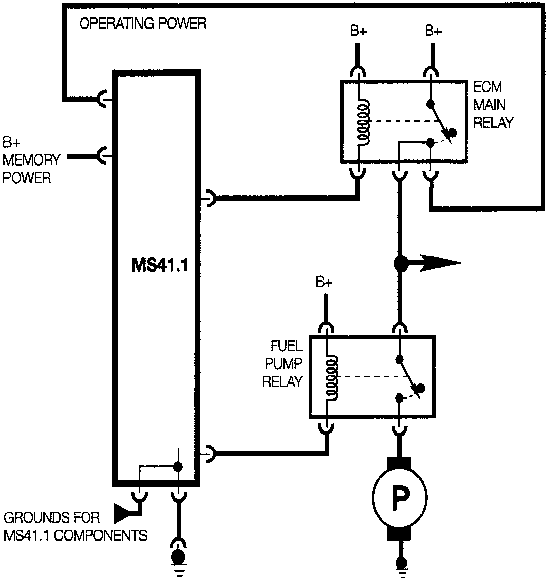 Control of the ECM and fuel pump relays is an output function of the MS41.1 Control Module. The operation is the same as the Bosch DME systems. When the ignition is switched "ON" (KL 15), the MS41.1 Control Module provides a ground for the control circuits of the two relays.