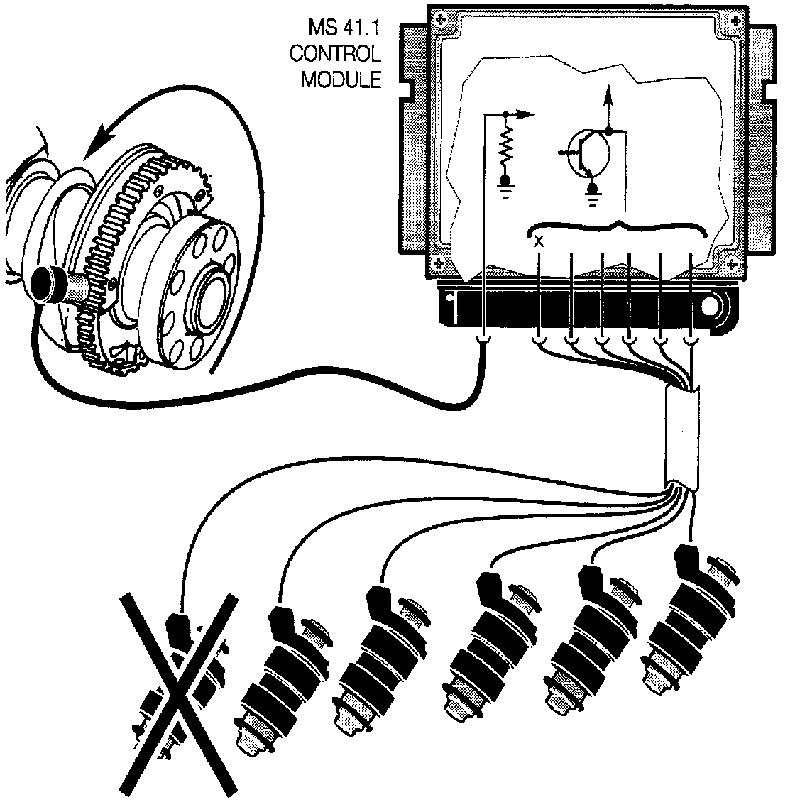 Selective injector canceling is used to limit the maximum engine RPM. The Siemens MS41.1 Control Module will shut down individual cylinders as required to prevent an overrev situation when the engine reaches the maximum rev limit.