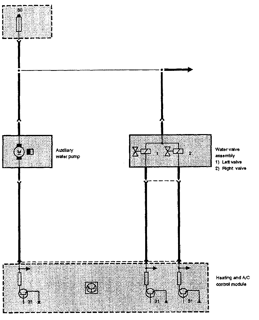 All models except E36/46 use an electrically powered auxiliary coolant pump to ensure that an adequate supply of hot coolant is always available to the heater core(s). The IHKA control module operates the pump directly (E31 uses a relay) by supplying the ground circuit.
