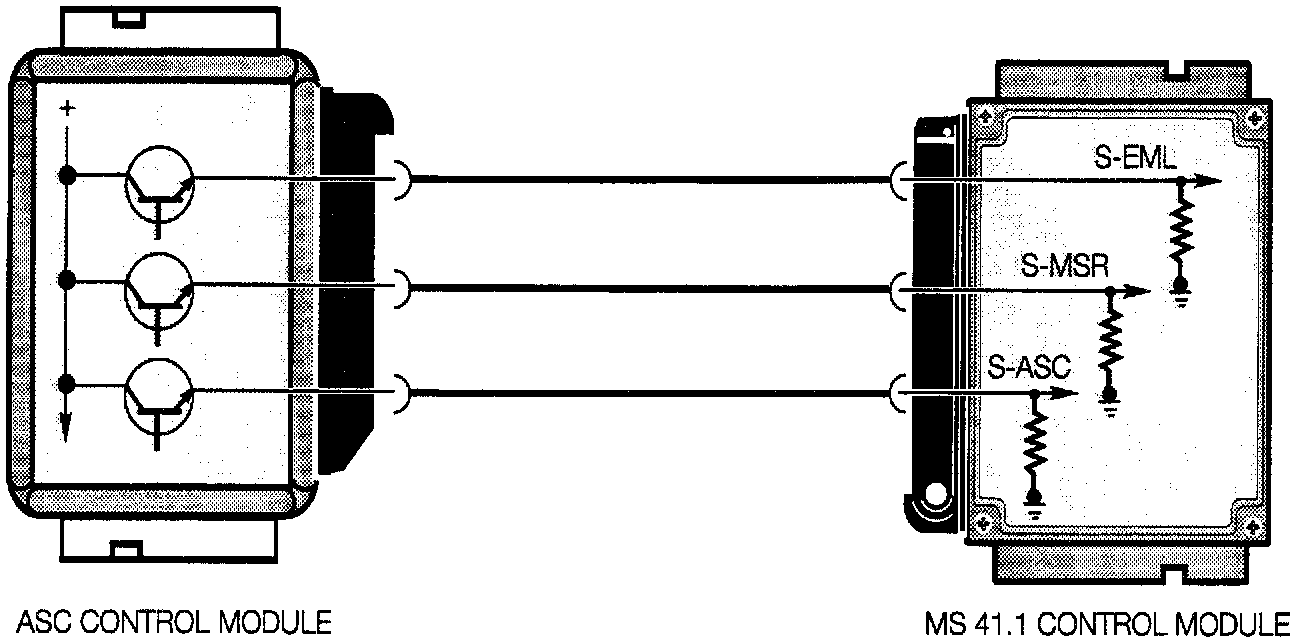 The MS41.1 Control Module is linked to the ASC control module through three signal lines for ASC regulation. The three signals are switched high/low input requests for power reduction/drag torque reduction. The signal paths follow the same logic as the Bosch engine management systems including: