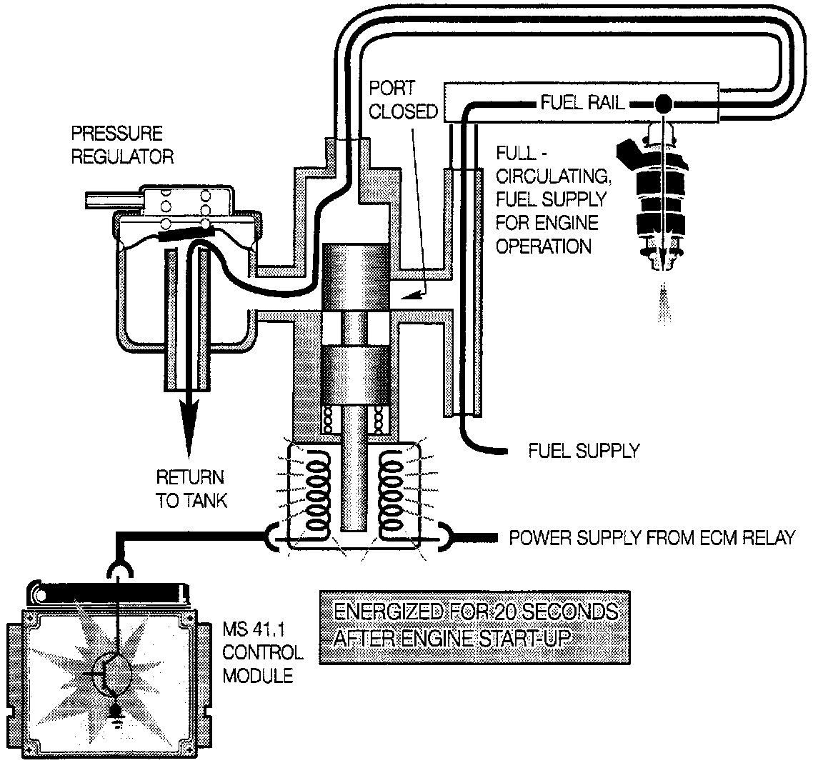 The MS41.1 control module controls the operation of the by-pass solenoid. The solenoid is energized for 20 seconds on engine start up to purge air bubbles.