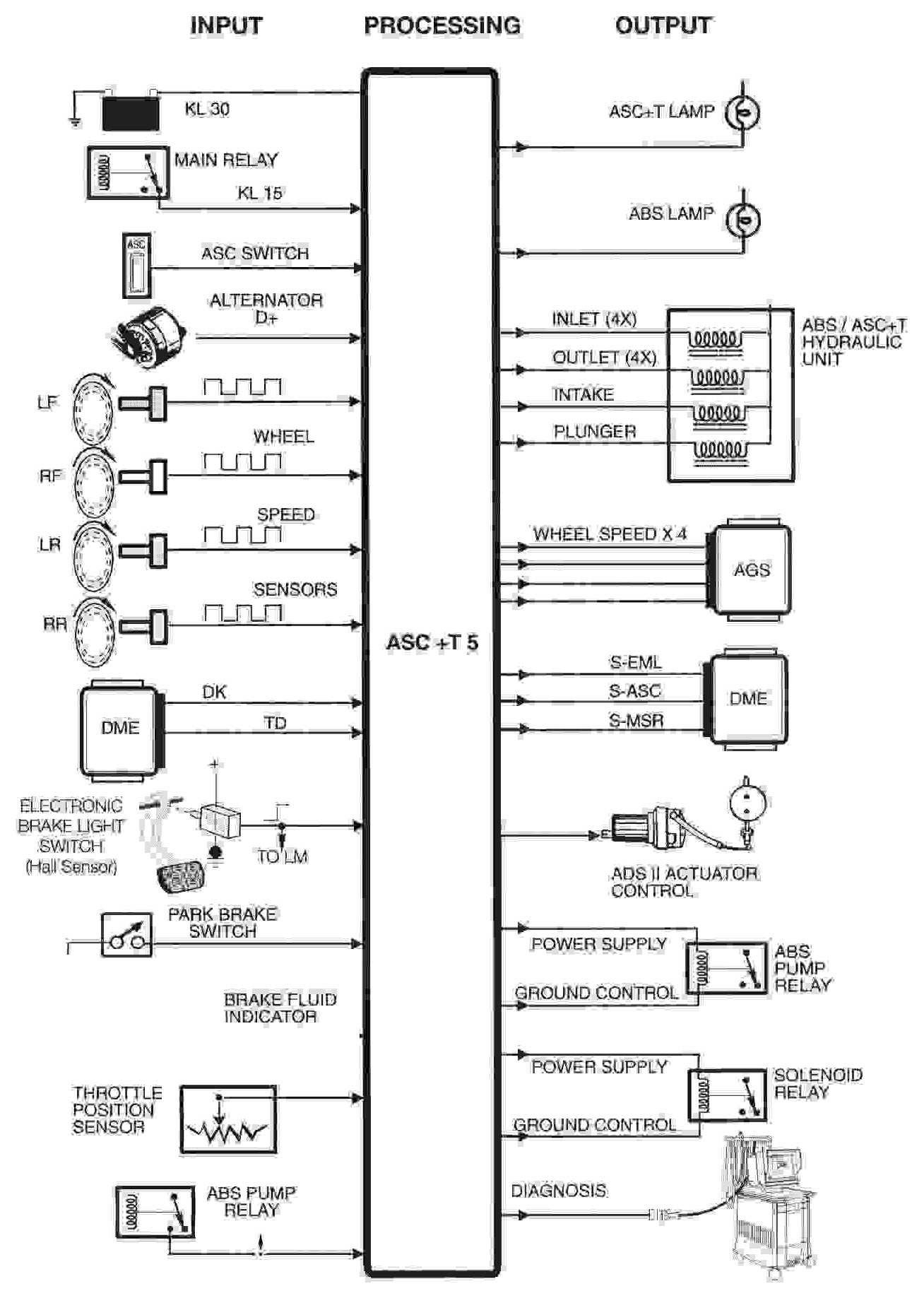All of the AST systems are electronic control systems that monitor the wheel speeds and all of the signals as shown in the IPO. The control module activates solenoid valves in the AST hydraulic unit which control the hydraulic flow of the brake fluid pressure for the purpose of braking and or traction control.
