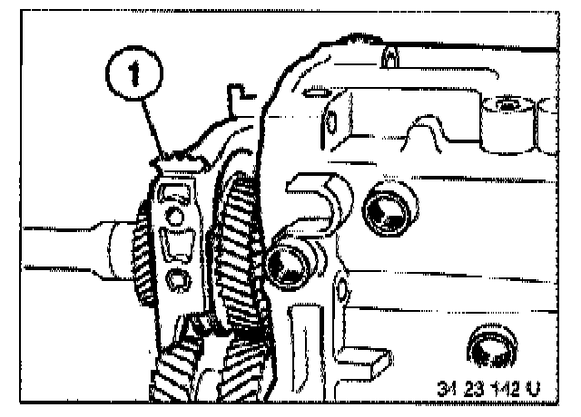 Install 5th/reverse gear shift arm and slide with catch (1) facing to the left in the 5th/reverse gear operating sleeve.