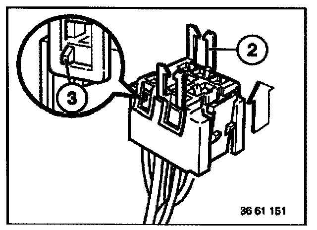 Place special tool 61 1 153 on relay carrier (1) and carefully pull in direction of arrow until retaining lugs (2) on relay carrier are raised.