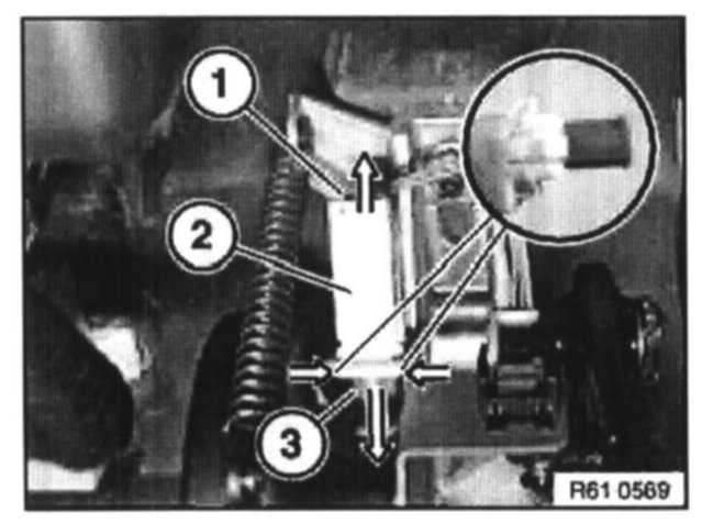 Press both retaining clips together at front end and pull out switch (2) in direction of arrow towards rear.