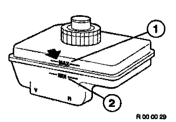 - If the fluid level in the expansion tank has dropped to to min. mark (2), either the brake pads are worn or the brake system is leaking. It is not enough merely to top up the brake fluid. It is absolutely essential to identify what has caused the brake fluid level to drop.