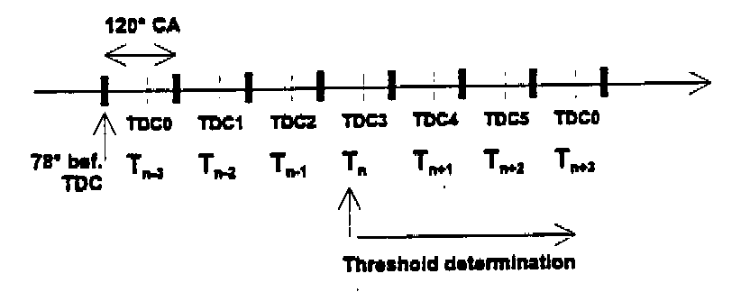 The segment periods are measured through an angular range of 120° crank angle. The segment starts 75° before TDC. The beginning and end of the segments are located at the same angle.