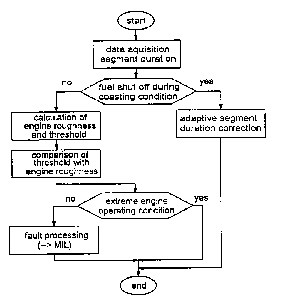The engine roughness is derived from the differences from the segment periods (120° crank angle) durations which are corrected and compared to a load and engine-speed dependent thresholds. Different statistical methods are used to distinguish between normal changes of the segment duration and changes due to misfire.