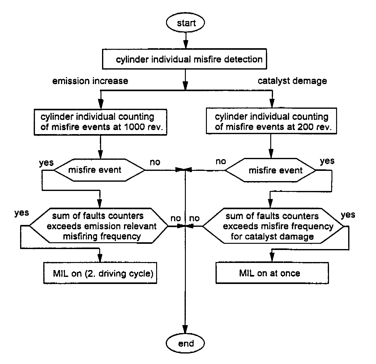 Within an interval of 200 crankshaft revolutions the detected number of misfiring events is weighted and calculated for each cylinder. The weighting factor is determined by a load/speed dependent map. If the sum of cylinder misfire incidents exceeds a predetermined value a fault code is stored and the MIL is illuminated at once. If the cylinder selective count exceeds the predetermined threshold the following measures take place;