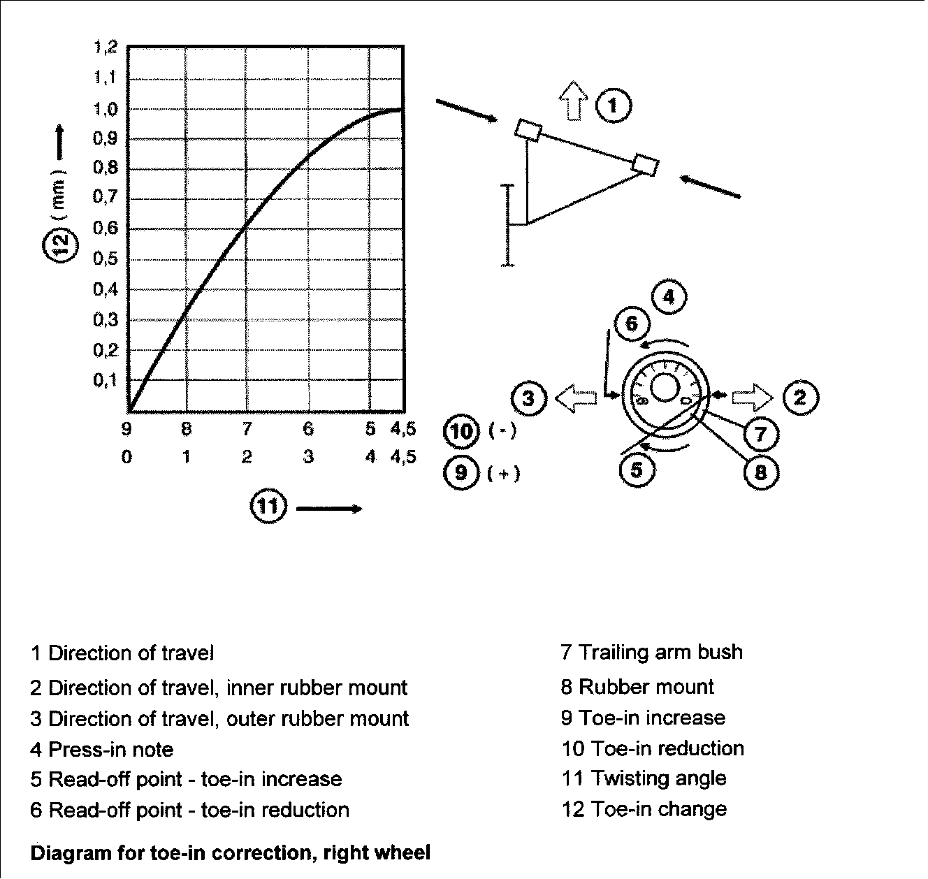 Using the Diagram For Toe-in Correction illustrations below for the corresponding side (left/right), determine the number of the toe-in increase or reduction (0 to 9) for the correction value (e.g. 1 mm).