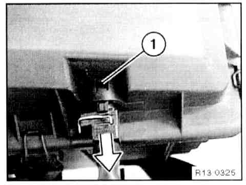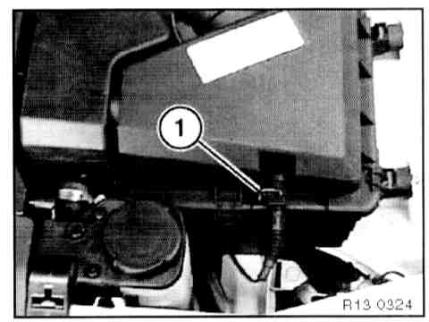 - Depress interlock button (1), unclip temperature sensor and remove from intake air manifold.