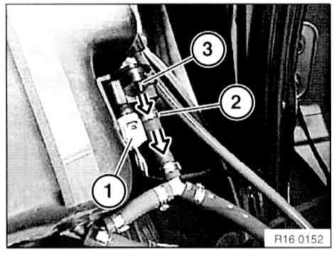 - Open hose clamp (2) and detach hose. Detach tank pressure sensor (3) from both retainers.