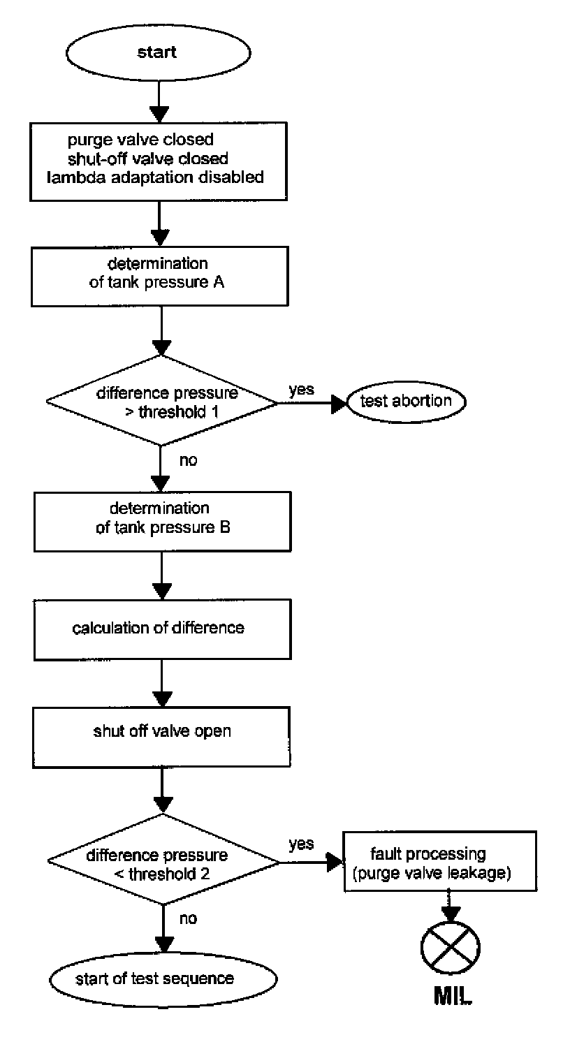 The evaporative emission control system is hermetically sealed off from the atmosphere by means of a shut-off valve at the charcoal canister. When the purge valve opens, the engine generates a vacuum in the tank. After closing the purge valve the pressure increase is measured by a tank pressure sensor. If the vacuum increases above a defined threshold a leak is detected.
