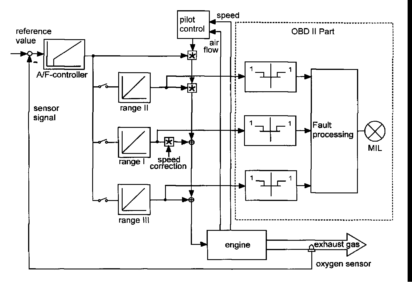 The ECM-controller compares the oxygen sensor signal of the sensor upstream the catalyst with a reference value and calculates a correction factor for the pilot control.
